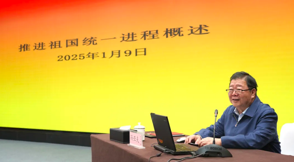 海峡两岸关系协会副会长、全国台湾研究会副会长孙亚夫作专题讲座。(图片来源:“北京台联”微信公众号)