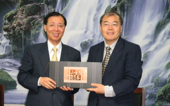 黄德福(左)与周志怀(右)互换礼物。(全国台湾研究会 高琛 摄)