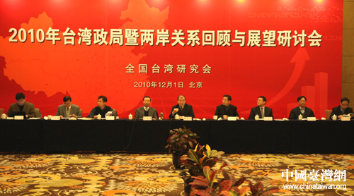中国台湾网12月1日北京消息 1日上午,全国台湾研究会在北京举办“2010年台湾政局暨两岸关系回顾与展望”研讨会,邀请两岸专家学者回顾和总结一年来的岛内政局与两岸关系发展,以及台湾年底“五市选举”后的两岸关系发展趋势进行深入探讨。与会的四十余位专家学者来自全国各地包括海峡对岸的研究机构和高校,海峡两岸关系协会副会长王在希、中华文化发展促进会副会长辛旗等出席了研讨会。