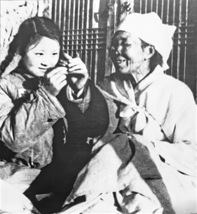 叶宇阿姨在朝鲜战场帮助朝鲜老大娘金玉缝衣服。(图片来源:人民政协报)